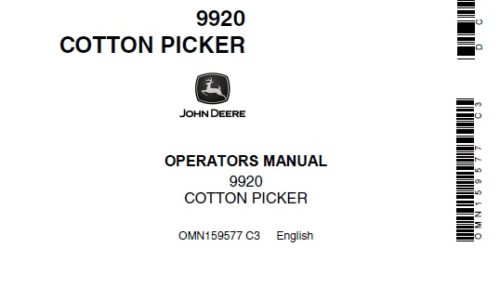 Download Operator’s Manual For John Deere 9920 Cotton Picker. PART No. OMN159577 C3 This manual contains information concerning the adjustment and maintenance of the John Deere 9920 Cotton Picker. Please …