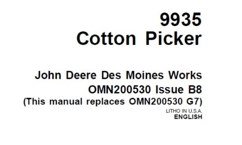Download Operator’s Manual For John Deere 9935 Cotton Picker. PART No. OMN200530 Issue B8 (This manual replaces OMN200530 G7) This manual contains information concerning the adjustment and maintenance of the …