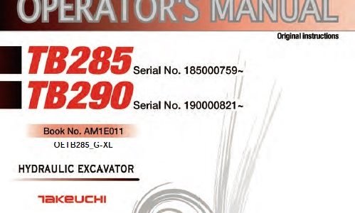 Download Operator’s Manual For Takeuchi TB285, TB290 Hydraulic Excavator. Book No. AM1E011 OETB285_G-XL This manual contains information concerning the adjustment and maintenance of the Takeuchi TB285, TB290 Hydraulic Excavator. Please …