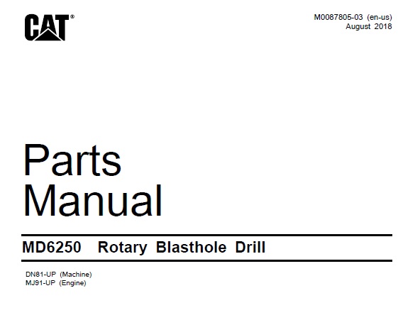 This Factory Parts Manual offers all the parts information about Caterpillar Cat MD6250 Rotary Blasthole Drill. The information on this manual covered everything you need to know when you want to repair or service on Caterpillar Cat MD6250 Rotary Blasthole Drill.