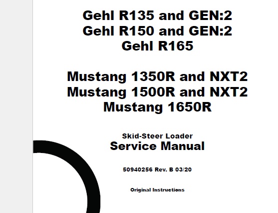 Download Service Repair Manual For Gehl R135 and GEN:2, R150 and GEN:2, R165 & Mustang 1350R and NXT2, 1500R and NXT2, 1650R Skid-Steer Loaders.